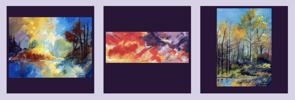 His signature series, Ethereal Environments, has evolved over the past 30 years. Inspired by his love of the natural world, he uses cubist abstractions, light and color elements, and serene settings to express modernistic scenic images.
